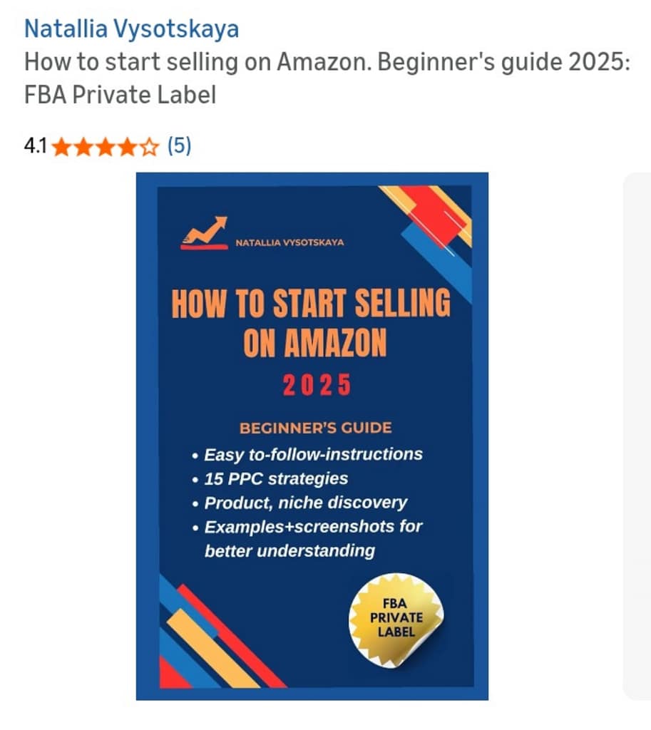 A key promise of the book is a set of “15 PPC strategies,” meaning it dedicates an important section to Amazon advertising and how to use pay‑per‑click campaigns to drive traffic and sales profitably. It also emphasizes product and niche discovery, indicating that readers learn how to research demand, competition, and margins before investing in inventory. The author, Natallia Vysotskaya, presents herself as a practitioner who distills her knowledge into easy‑to‑follow instructions tailored to current 2025 conditions, with a focus on helping beginners avoid common mistakes and build a sustainable private‑label brand on Amazon.
